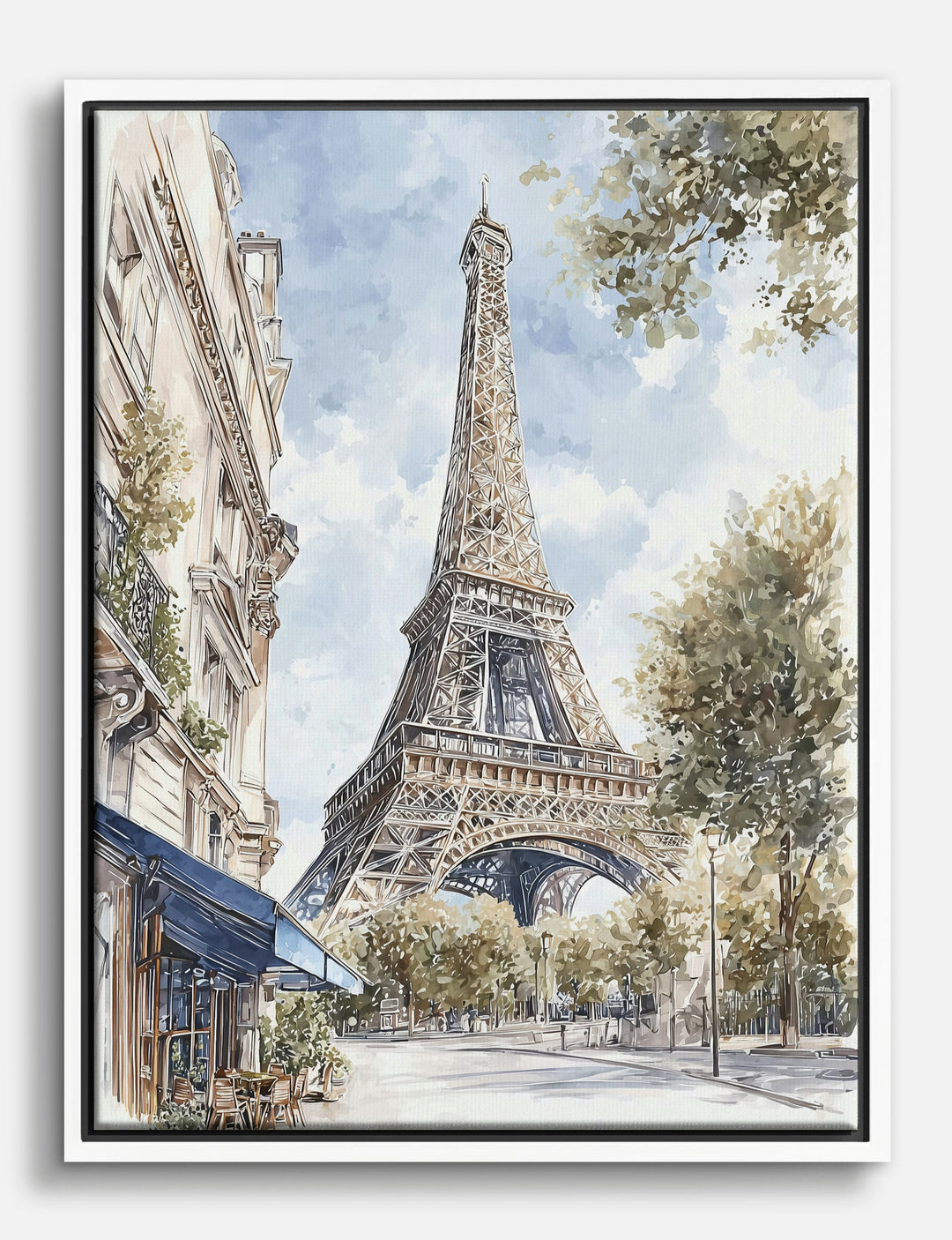 Let a touch of Parisian magic sweep into your home. This watercolor captures the Eiffel Tower rising above leafy boulevards and sunlit cafés, all in soft, inviting hues. Its more than just a view — its the feeling of a spontaneous afternoon adventure in the heart of Paris, right from your own space.