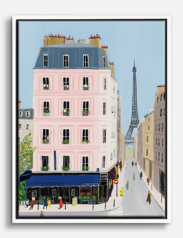 Feel the charm of Paris come to life right on your wall. Soft pinks and classic architecture set the stage, while the iconic Eiffel Tower peeks playfully in the distance, promising a daily dose of wanderlust. This piece captures the gentle hum of city life, with people strolling past cozy cafés and sunlit windows.