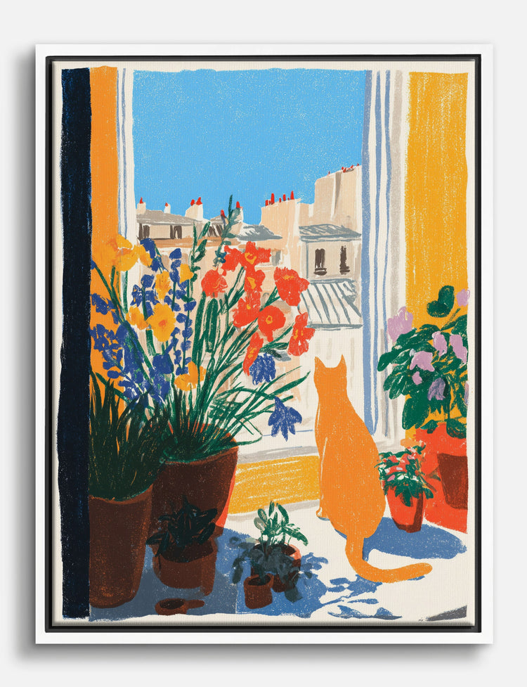 Sunlight, city rooftops, and a curious cat—this piece radiates the simple joys of everyday moments. A burst of bold florals and a playful feline silhouette instantly bring warmth and personality to any space.