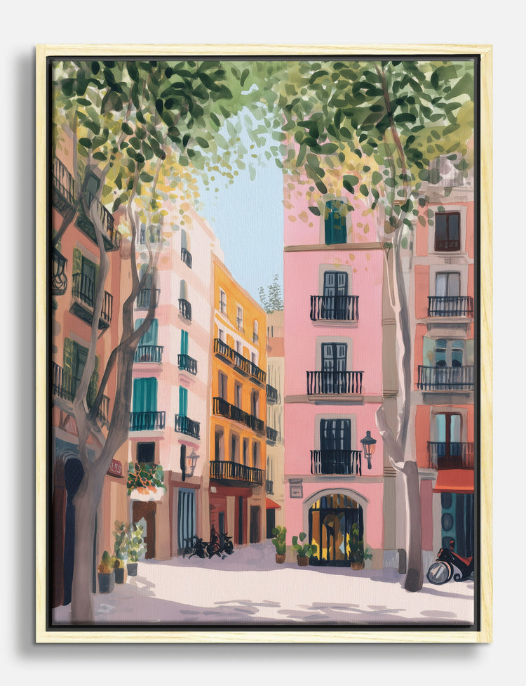 A sun-dappled city corner, where pastel pinks and warm yellows invite you to slow down and savor the moment. This vibrant scene transports you straight to a charming Barcelona plaza, filling your space with the easygoing joy of Mediterranean afternoons.