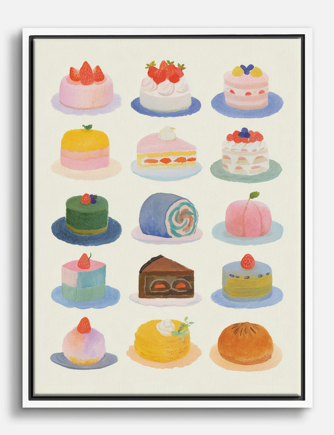 A colorful parade of cakes brings instant cheer to any wall. Each sweet watercolor delight pops with playful pastels, making your space feel both chic and inviting.