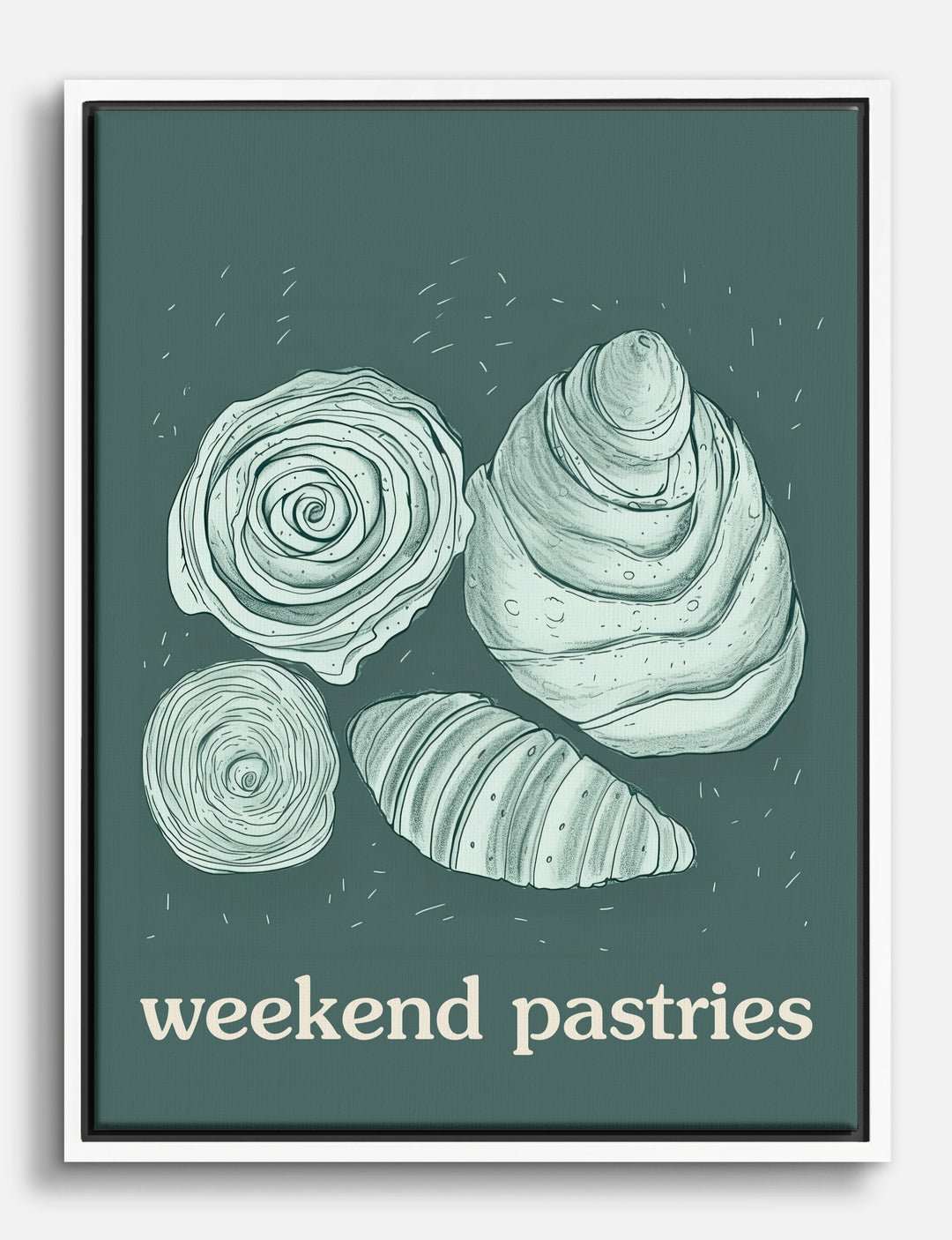 There’s something undeniably inviting about the gentle swirl of pastries—almost like a cozy weekend morning, captured forever. This charming print brings that sense of comfort into your kitchen or dining space, instantly warming up your home with its soft, hand-drawn lines and soothing teal palette.