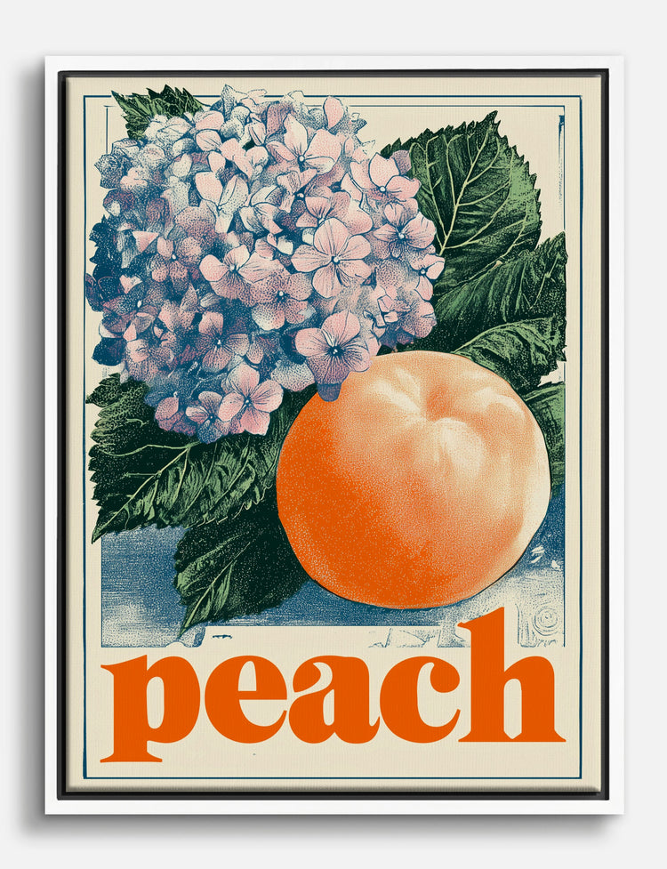 A burst of sun-kissed peach meets the soft charm of vintage florals—this piece is pure joy for your walls. The playful pairing of lush hydrangea blooms and a glowing peach brings a fresh, inviting energy to any room.