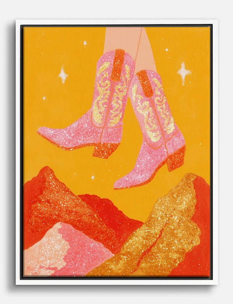 Bold color and a sense of adventure define this playful piece. Two sparkling pink cowboy boots stand out against glowing orange and gold, ready to kick up dust and turn every day into something extraordinary.