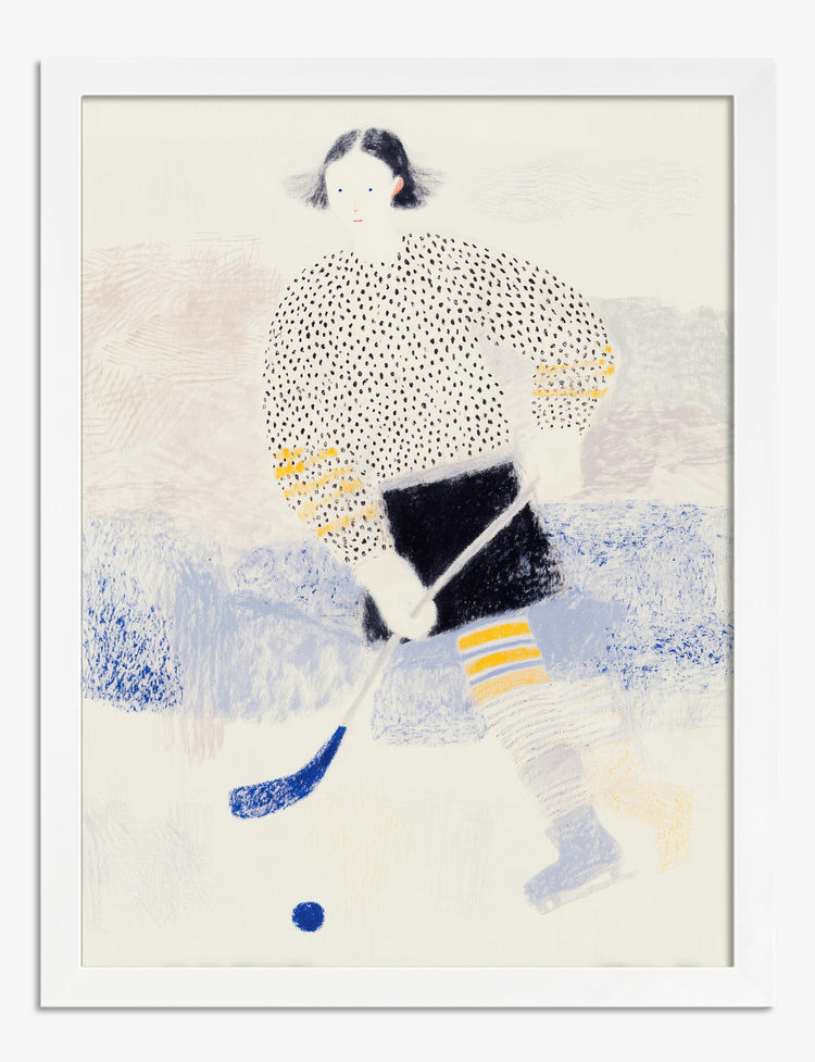 Who says athletic energy cant be stylish? This piece captures the joy and motion of a hockey game with a fresh, modern twist. Bold dots, unexpected pops of yellow, and a cool, almost wintry palette bring a playful edge to your space. Bring this artwork into your living room, office, or hallway for a burst of personality thats equal parts sporty and chic. Its crisp blues and graphic black-and-white details blend effortlessly with both minimalist and maximalist decor. Let this print remind you every day that your home is your arena — full of energy, movement, and your unique story. With Fab, making your walls stand out is as easy as scoring a goal.