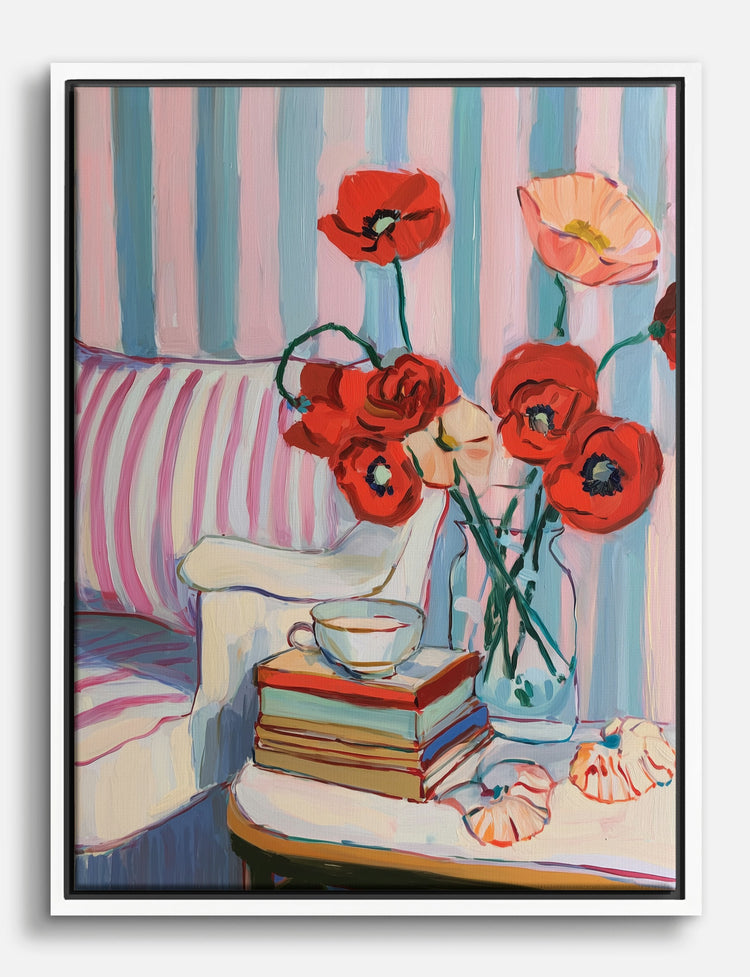 Bold poppies meet playful pastels in a scene that instantly brightens your every day. This piece is like a fresh bouquet for your walls—vivid reds, soft blues, and pink stripes mingle to create a mood that’s both lively and serene.