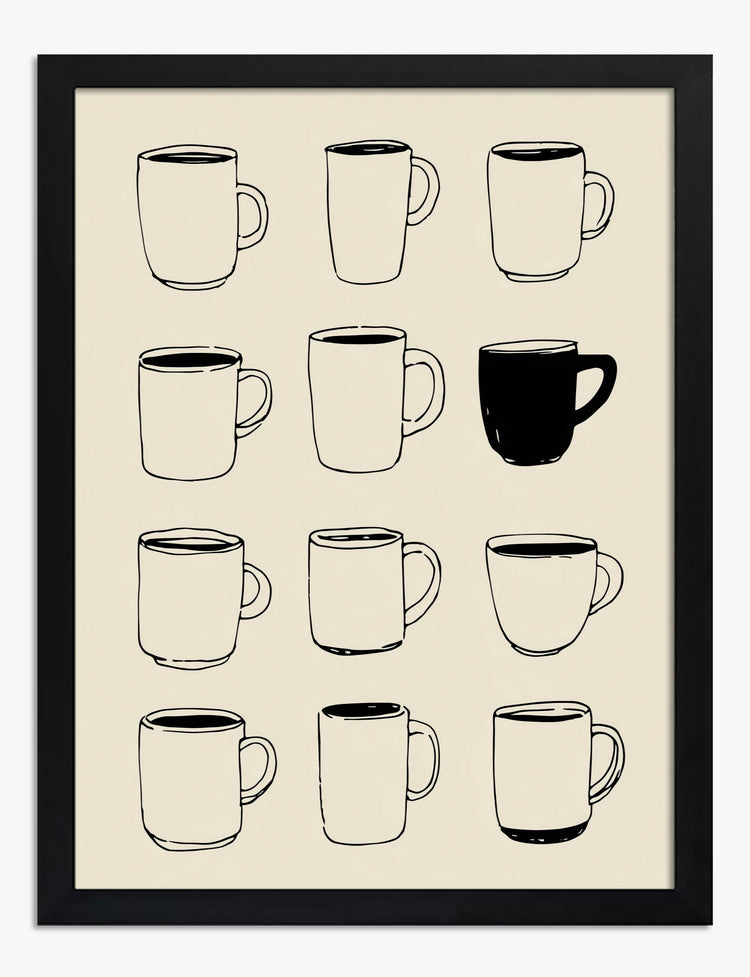 Who says your morning routine has to be ordinary? This playful lineup of coffee mugs brings a dose of personality and charm to your walls. Each hand-drawn mug is unique, but one bold, black standout makes the whole collection pop. Perfect for kitchens, breakfast nooks, or even your cozy office corner, this piece adds a touch of whimsy and warmth wherever it hangs. The neutral beige and black palette means it’ll mix effortlessly with modern, minimalist, or eclectic décor—no need to rethink your space. Let this print remind you: every day is a little brighter when you celebrate what makes you (and your home) one of a kind. Display it proudly and watch your daily grind feel a whole lot more inspiring.
