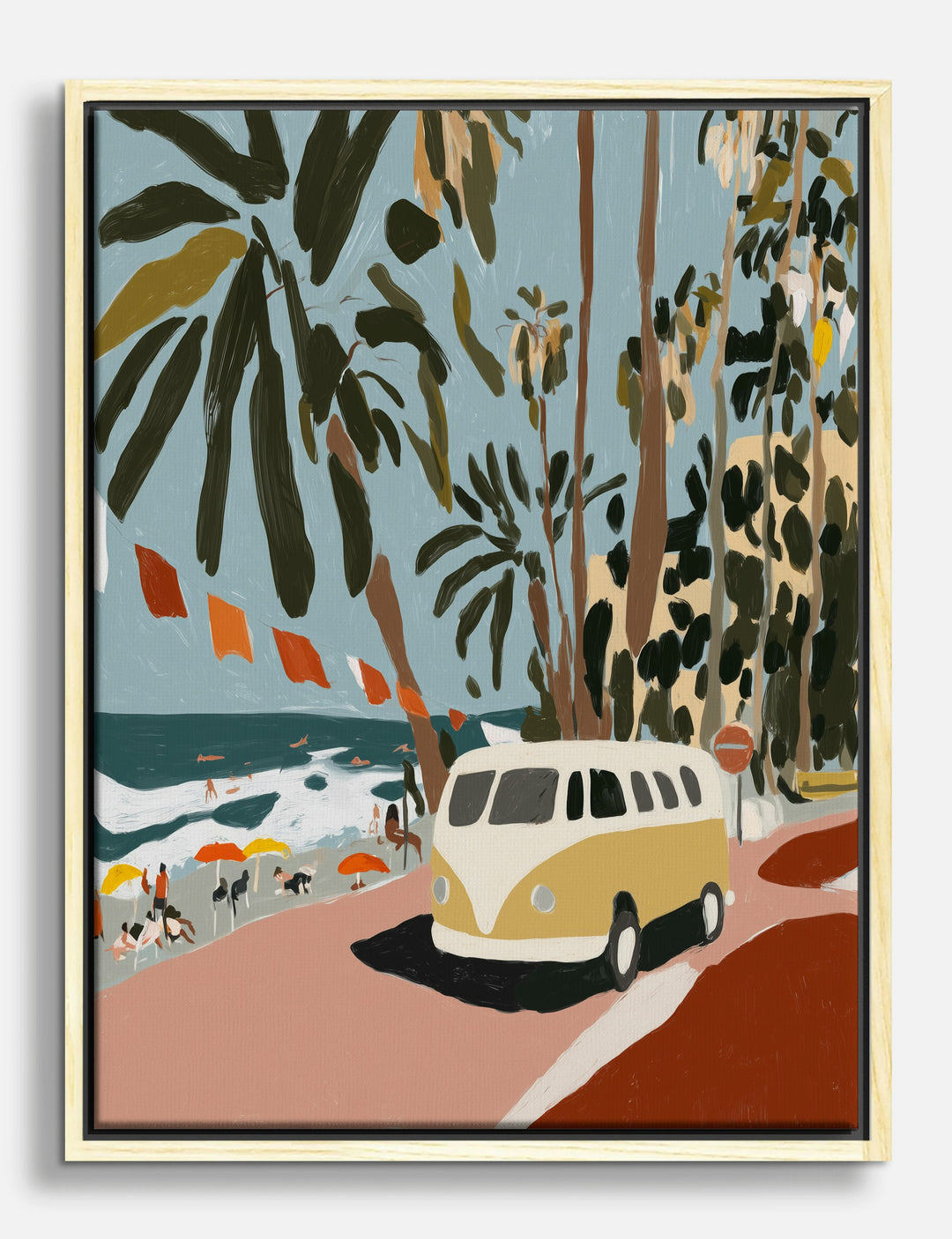 Step into a scene that feels like summer never ends. A classic camper cruises along a palm-lined coast, bright umbrellas dotting a sun-soaked beach just beyond. This piece instantly brings a breezy, laid-back vibe to your space—think of it as a mini vacation for your walls. Perfect for your living room or entryway, it sets a joyful, adventurous tone that welcomes everyone in. The warm yellows and soft blues pop against neutrals or pair beautifully with mid-century or modern decor. Youll love how this artwork transforms your space into a destination—no passport required. Make every day feel like a carefree road trip with this unique, stylish print thats just as fun as you are.