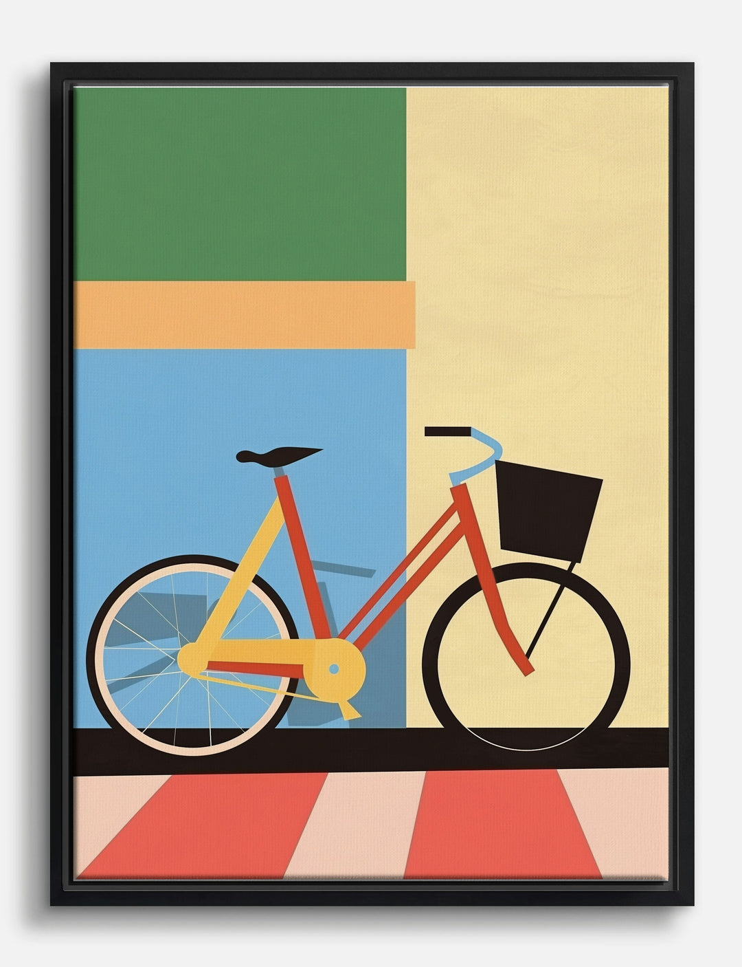 Ride into a world of charm and nostalgia with this vibrant retro bicycle artwork. Perfect for adding a touch of whimsy to your living room or entryway, this piece transforms your space with bold colors and playful design. Let its lively palette of reds, yellows, and blues energize your decor, making it uniquely yours.