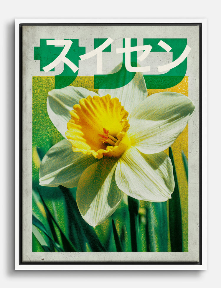 A single daffodil bursts with optimism, its sunny yellow center radiating against a lush green backdrop. This piece instantly brings a jolt of fresh energy and vintage flair to any room, like a splash of spring that never fades.