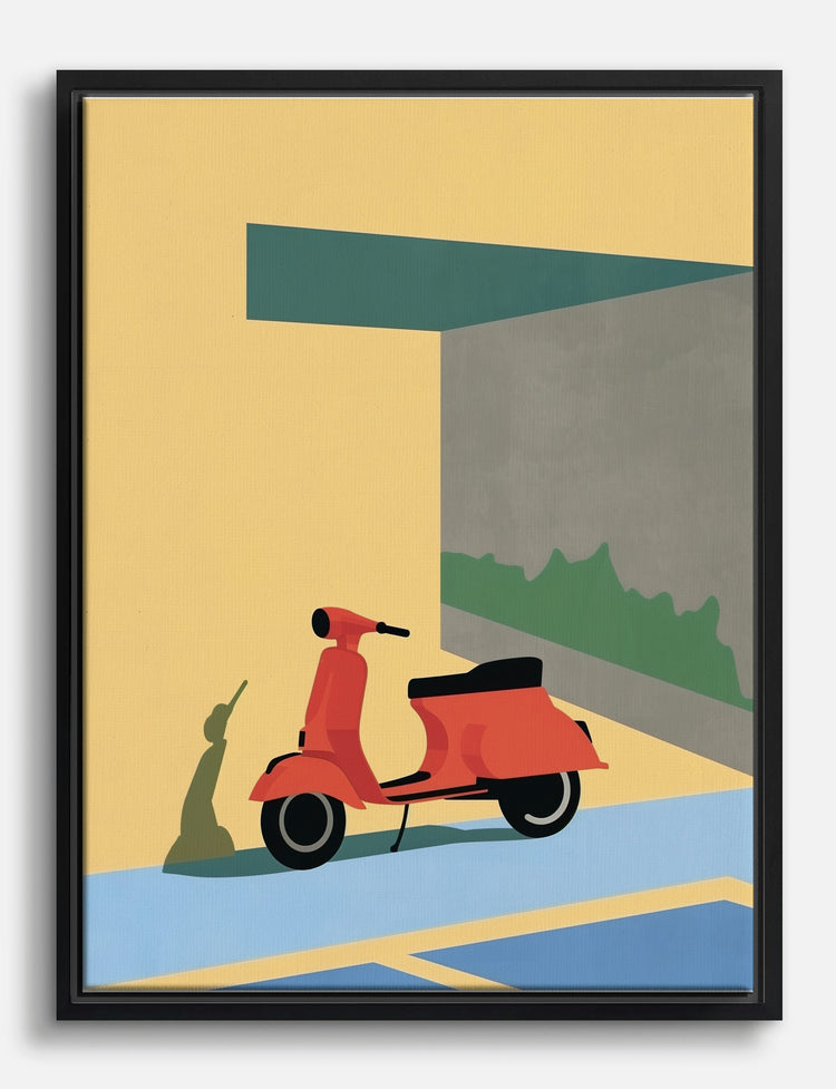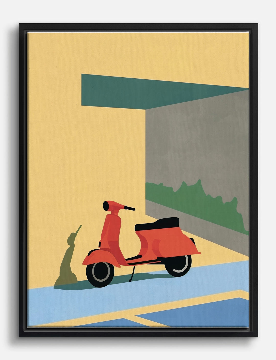 Feel the charm of Italys streets in your space with this vibrant Vespa illustration. Its bold red and playful design bring a splash of joy and adventure to any room. Perfect for your living room or office, this piece effortlessly complements modern and minimalist decor with its striking contrast and sleek lines. Transform your walls into a canvas of style and personality, making every glance a moment of delight.