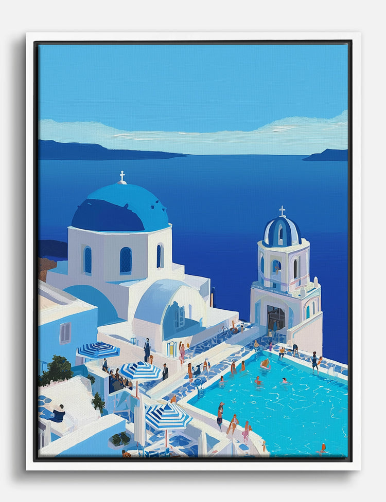 Sun-drenched rooftops and sparkling blue waters instantly transport you to a Greek getaway — no passport required. This vibrant piece pops with cool blues and crisp whites, capturing the pure joy of summer in Santorini.