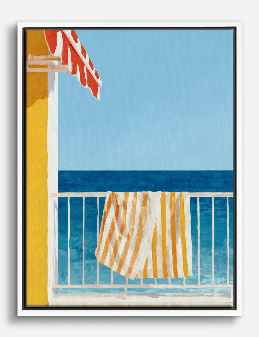 Sunshine and salt air—this piece brings that effortless summer vibe right into your home. A bold yellow wall, crisp white railing, and a sun-bleached towel draped casually, all set against the endless blue horizon—instant mood booster. You’ll feel like you’re waking up steps from the water every day, whether this hangs in your living room or brightens up your bedroom. The punchy yellow and cool blues pop against any decor, making your space feel fresh, inviting, and uniquely you. Transform your walls with a splash of coastal confidence. It’s a reminder that style doesn’t have to be complicated—sometimes, it’s as simple as a sunny afternoon by the sea.