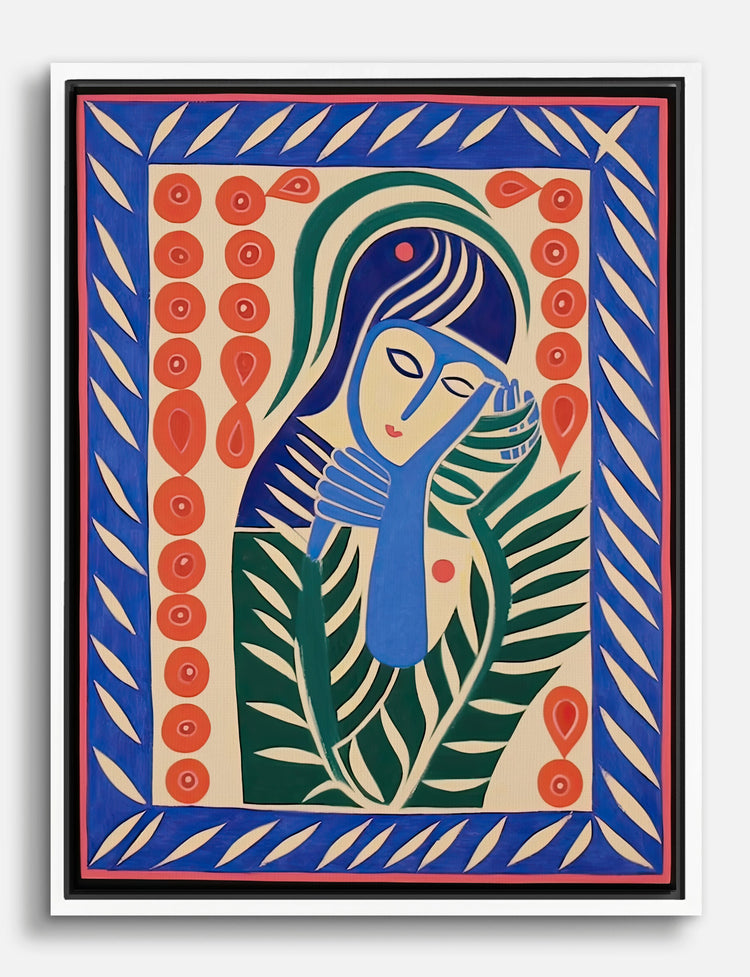 Bold lines and lush botanicals meet in this vibrant portrait, infusing your space with creativity and calm. The stylized figure, framed by playful patterns and rich colors, brings a touch of modern folk charm to any room.