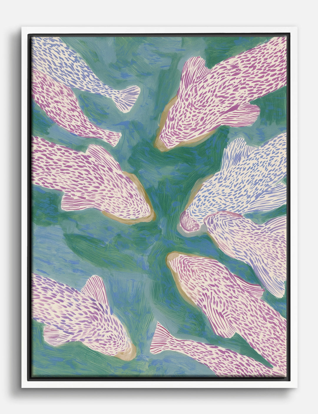 A swirl of koi glides gracefully across a tranquil, painterly pond—bringing a calm, organic energy to your walls. The soothing greens and soft pinks instantly transport you to a peaceful oasis, no matter where you hang it.