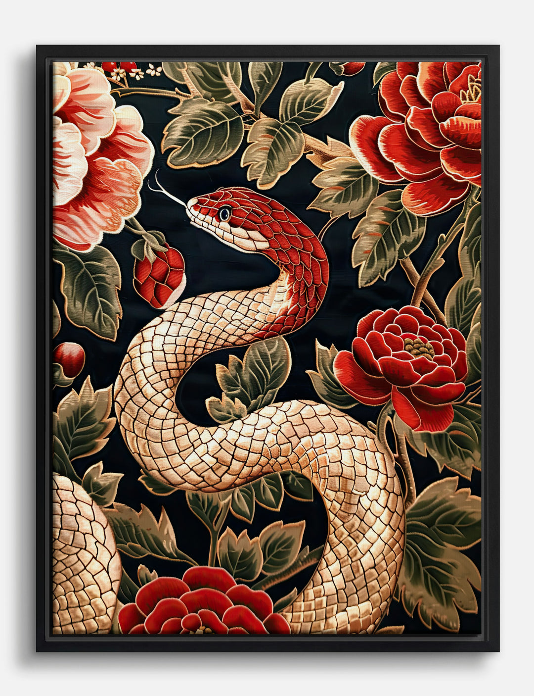 A striking serpent winds its way through lush red blooms, instantly infusing your space with a sense of mystery and bold self-expression. This piece brings together nature’s drama and elegance, making it a conversation starter wherever it hangs.