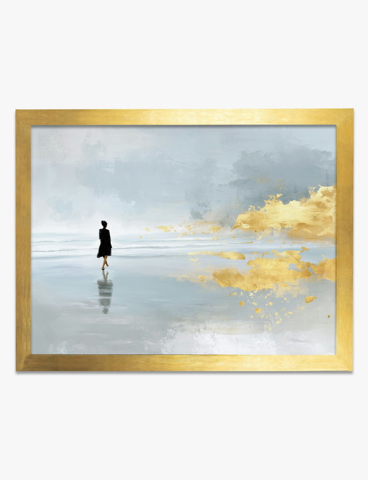 A single figure walks quietly along a shimmering shoreline, bathed in gentle light and golden haze. This piece captures that rare, peaceful moment when the world feels full of possibility—a little bit mysterious, a lot inspiring. Let your walls breathe with calm and confidence. Whether you hang it in your bedroom for a soothing retreat or in your living room to spark conversation, this artwork brings a sense of openness and wonder to any space. The soft blues and luminous golds play beautifully with modern, minimalist, or even eclectic decor, effortlessly elevating your home. You’ll love how its tranquil vibe makes your space feel like a personal sanctuary—fresh, stylish, and uniquely yours.