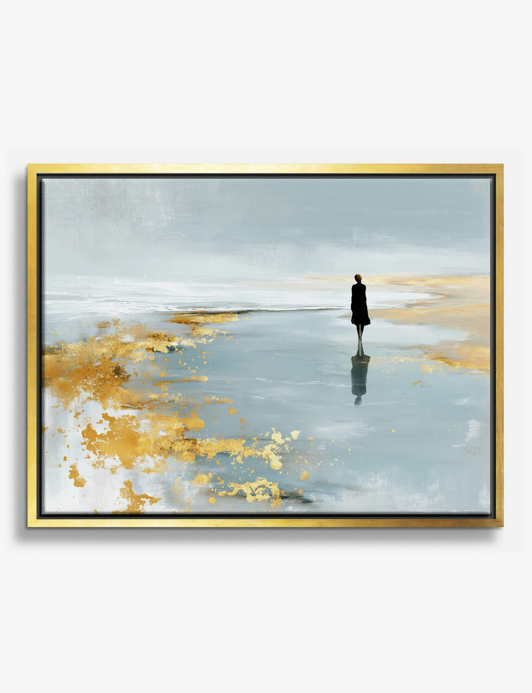 Ever notice how the quietest moments can make the biggest statement? This piece captures that feeling—a solitary figure reflected on shimmering sands, surrounded by strokes of gold and soft, dreamy blues. It’s the kind of art that instantly adds an air of calm and quiet confidence to your space. Perfect for your living room or bedroom, this print helps you create a sanctuary that feels both modern and inviting. The muted color palette, highlighted by warm golds and cool greys, fits effortlessly with minimalist, Scandinavian, or eclectic decor. Let this artwork remind you that your home is your haven—a place where you can pause, reflect, and feel proud of your unique style. With Fab, transforming your space is as easy as hanging up a moment of beauty.