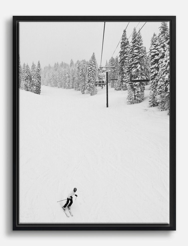 A single skier carves through a pristine winter wonderland, surrounded by towering snow-dusted pines. This black-and-white photograph captures the invigorating freedom of fresh powder and open space, inviting you to breathe deep and unwind.