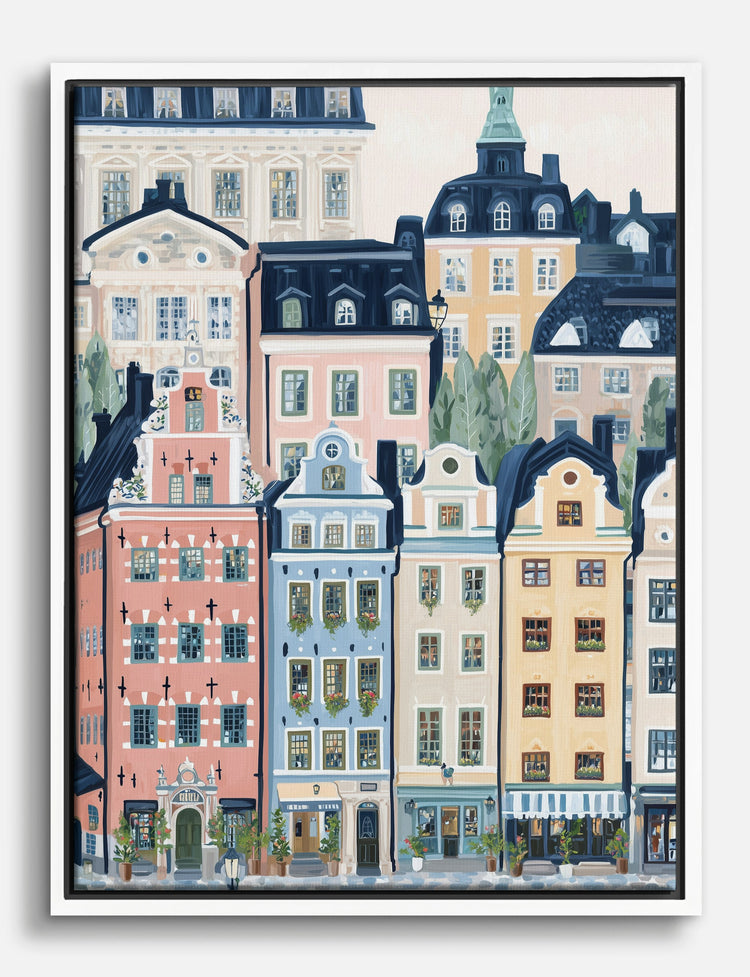 Step into a charming cityscape where every window tells a story. This watercolor captures the playful elegance of Stockholm’s iconic buildings, each façade painted in soft, inviting hues that instantly warm up your space.
