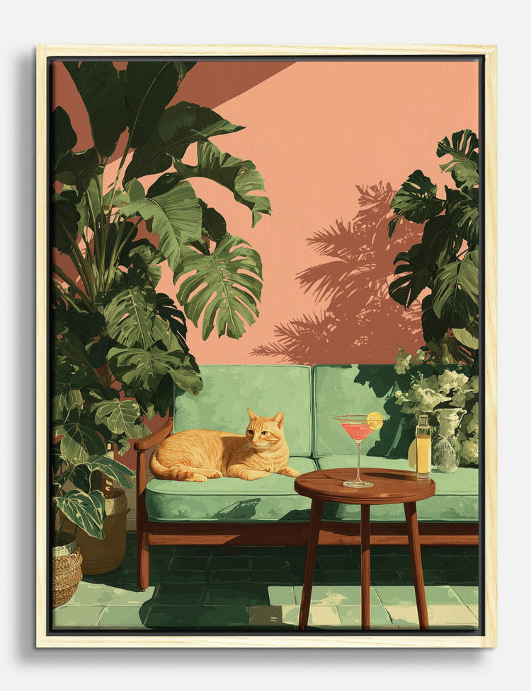 A lazy afternoon, a sun-drenched sofa, and your new favorite roommate—a ginger cat soaking in the golden hour. This print instantly brings a warm, relaxed vibe to any space, blending playful comfort with a splash of tropical greenery.