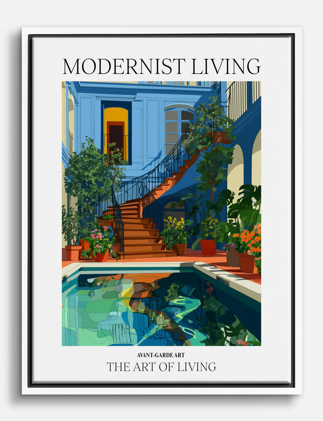 Step into a world where every day feels like a getaway. This vibrant courtyard scene, bathed in fresh blue and lush green, instantly brings a sense of warmth and openness to your space. The inviting pool and winding staircase create an effortless blend of elegance and relaxation — perfect for making your living room or entryway feel like a personal oasis.
