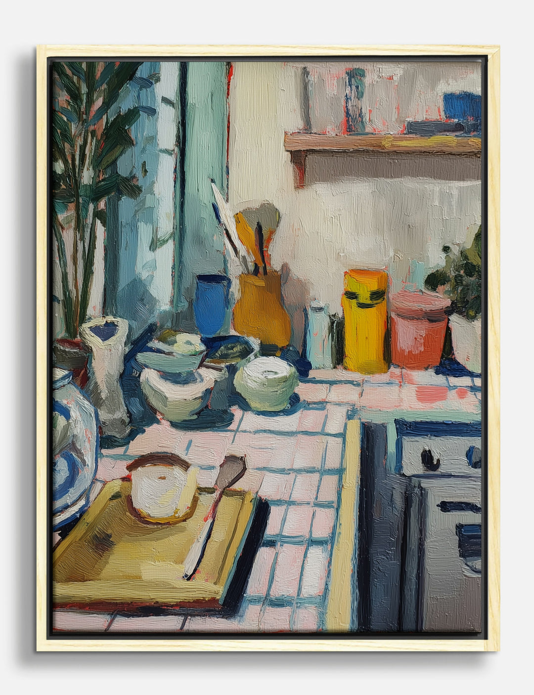Step into a morning moment where sunlight dances across countertops and everyday objects become art. This vibrant piece captures the cozy heart of home—a kitchen alive with color, warmth, and possibility.