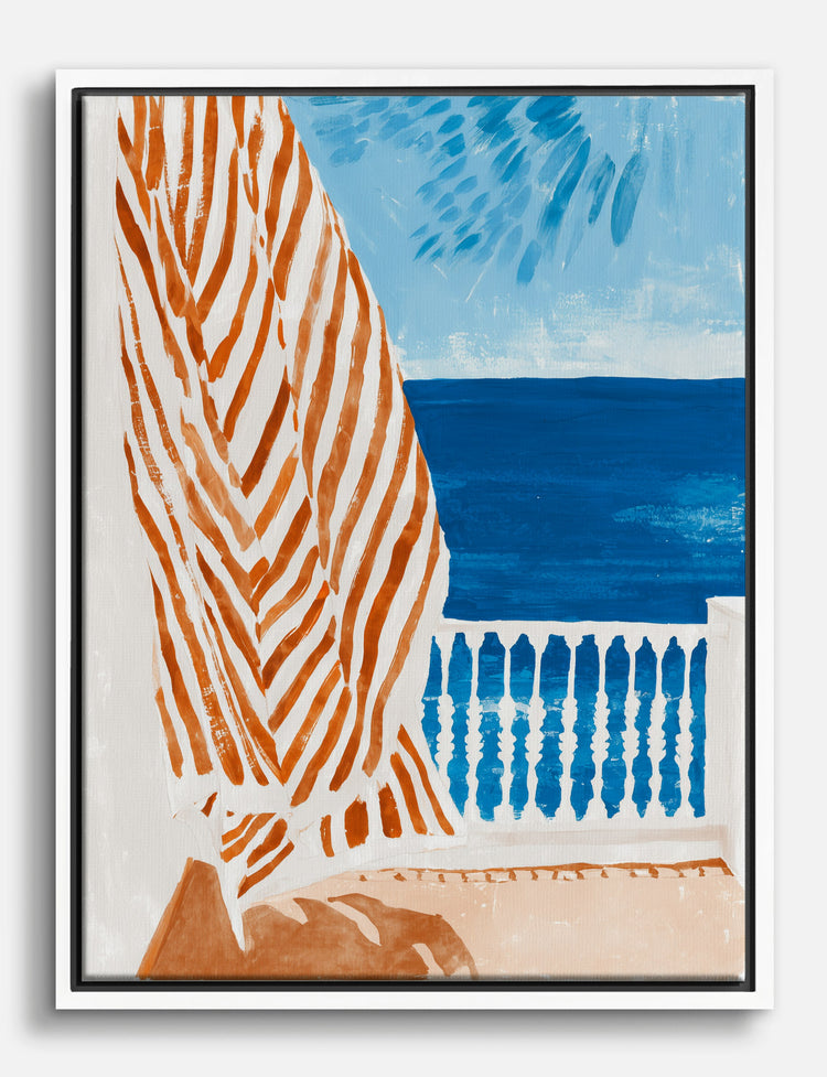 Wake up every day to the feeling of gentle coastal breezes and sun-warmed mornings. This piece captures that perfect moment — a striped towel fluttering in the salty air, blue waves shimmering just beyond a classic balcony. It’s the kind of art that instantly energizes your space, filling it with laid-back, Mediterranean charm. Hang it in your living room or bedroom and watch as the bold blue and warm rust tones pop against both light and dark walls. The relaxed, painterly style pairs beautifully with modern, minimalist, or boho décor, making it easy to elevate your home, no renovation required. Let your walls tell a story of summer escapes and everyday joy. With this print, effortless style is always within reach.