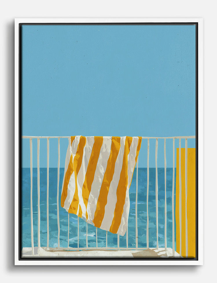 Bold stripes, endless blue — this piece brings the golden ease of summer right into your space. You’ll feel like you’re stepping onto a chic seaside balcony every time you walk by. Perfect for brightening up your living room, bedroom, or even a breezy hallway, its crisp yellow and white palette pairs beautifully with both modern and coastal decor. The pop of color instantly energizes your walls, while the tranquil ocean backdrop adds a calming balance. You don’t need a passport or a renovation to bring that vacation vibe home. With this print, your everyday can feel just a little more sun-kissed and stylish.