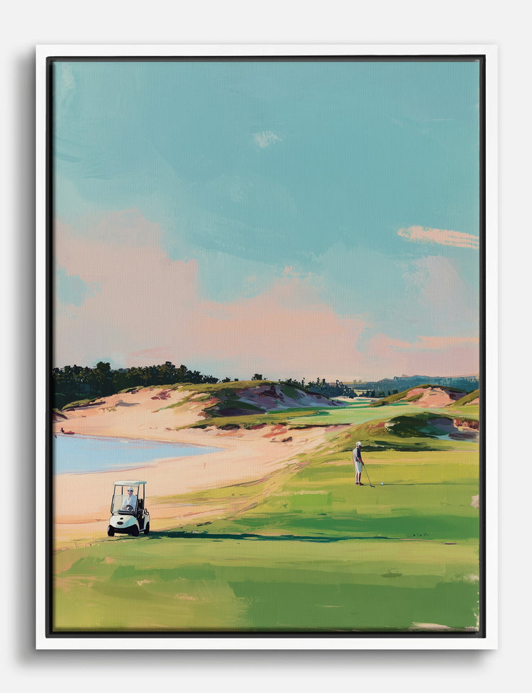 A gentle sweep of green meets an endless sky, inviting you to slow down and savor the view. This piece channels the calm of an early tee time, where the only sound is the soft thwack of a perfect shot. Whether you’re a golf lover or just crave wide-open horizons, it brings a breath of fresh air to your home.