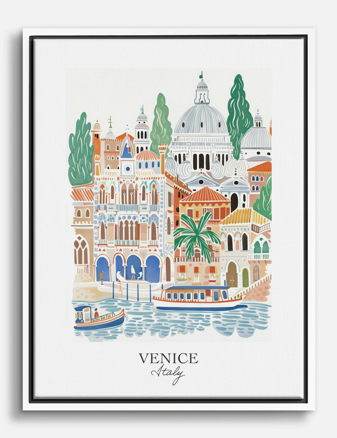 Dive into the enchanting canals of Venice with this vibrant illustration. The rich palette of blues, greens, and warm terracotta hues captures the iconic architecture and serene waterways, bringing Italian elegance right into your home. Perfect for your living room or bedroom, this piece will inspire wanderlust and add a splash of European charm to your decor. Let it transform your space into a celebration of culture and style.