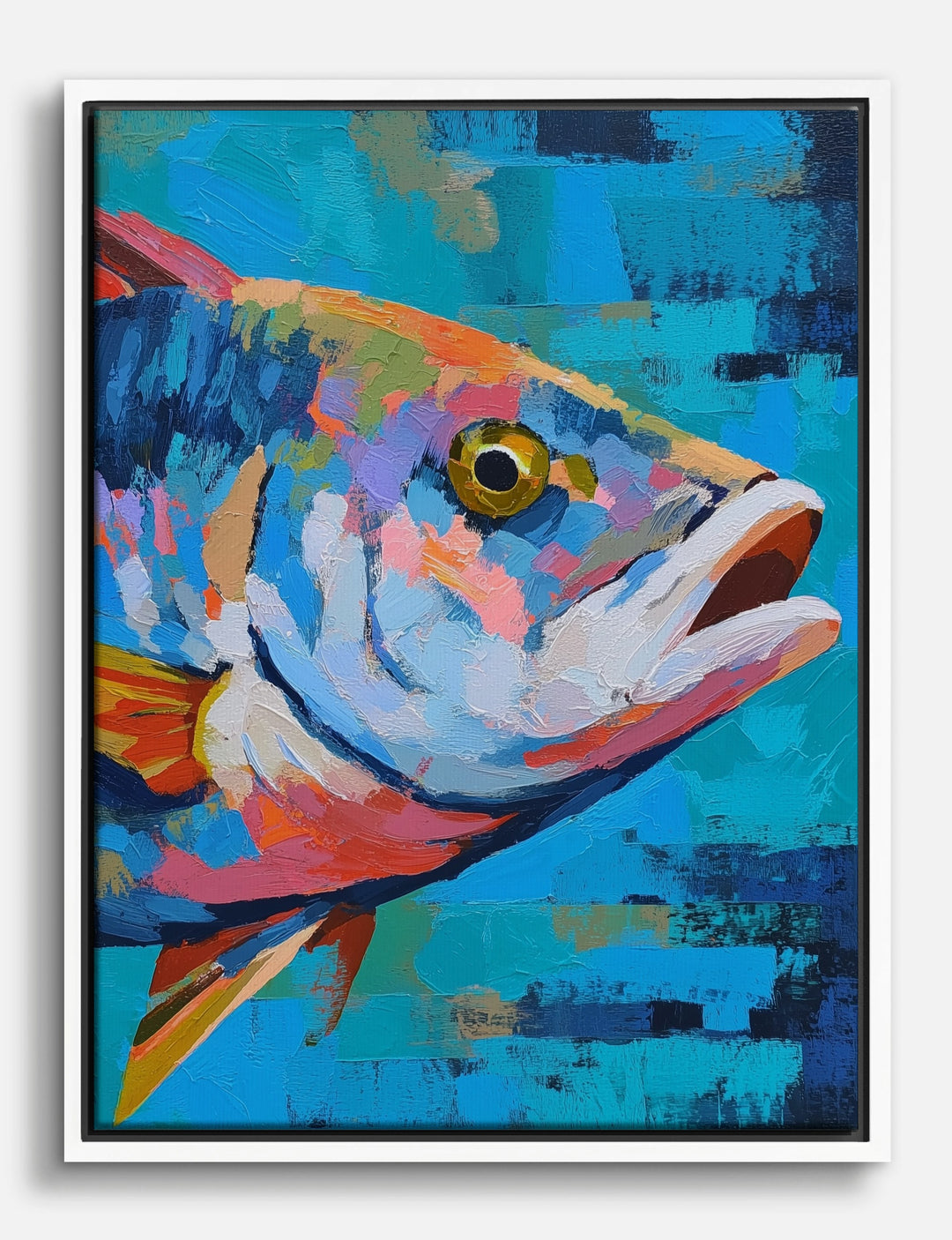 Ready to make a splash? Let this bold, contemporary fish portrait bring instant energy and playful style to your space. Lively strokes of electric blue, coral, and golden yellow pop against a mesmerizing aqua background—turning a simple wall into a statement.