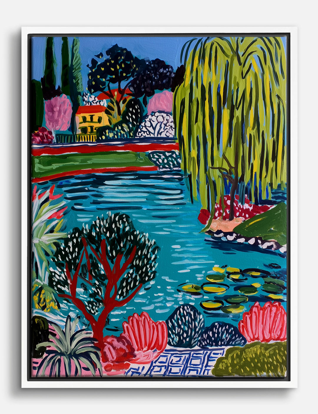 Bold color and joyful energy leap off this lakeside scene, instantly brightening any space. Picture yourself unwinding beside these lively waters, surrounded by whimsical trees and lush gardens—no passport required.