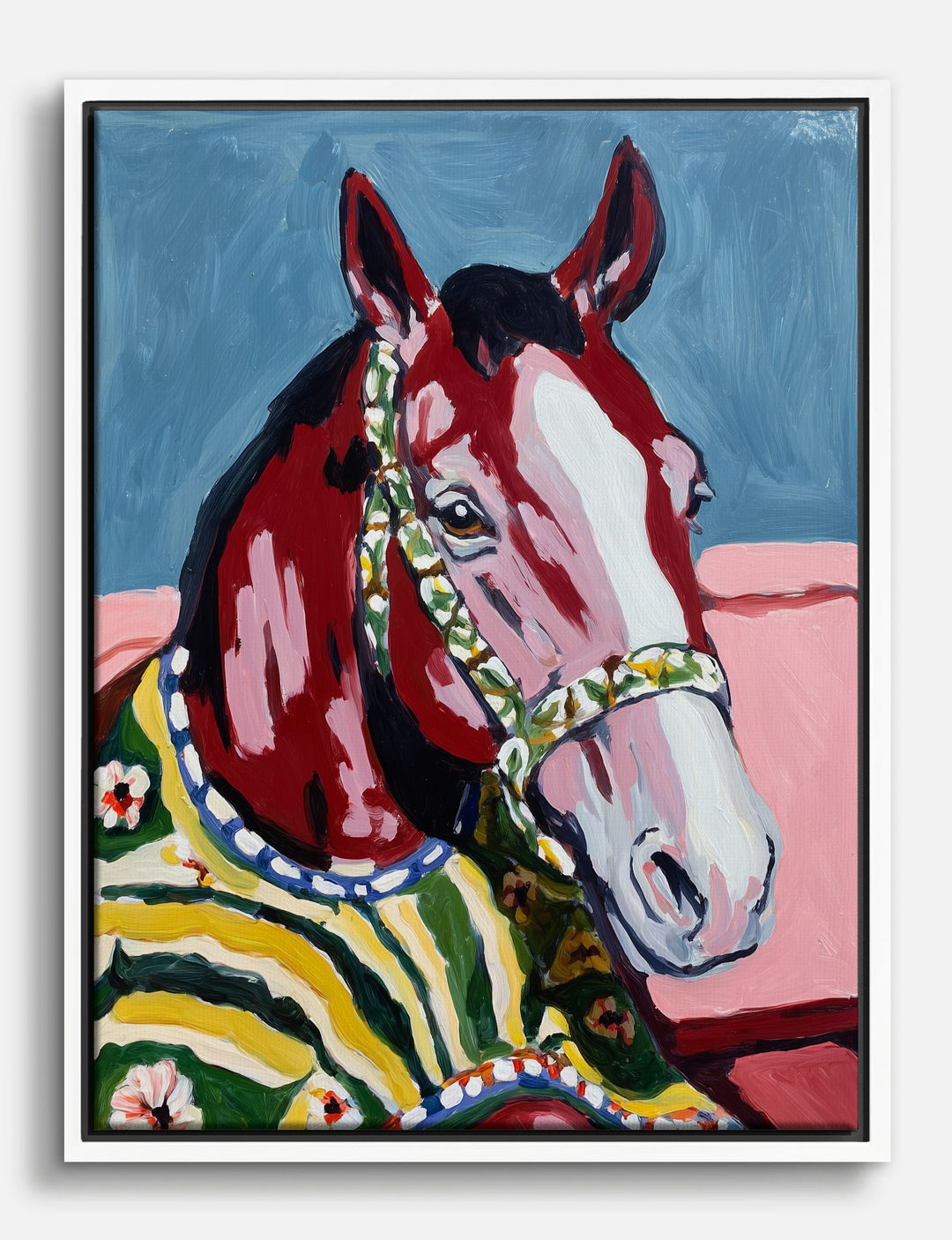 Who says your walls cant have personality? This bold, modern horse portrait is here to shake things up with its joyful palette and playful energy. Deep reds and lush greens pop against a soft blue background, while floral patterns and stripes add a touch of unexpected whimsy.