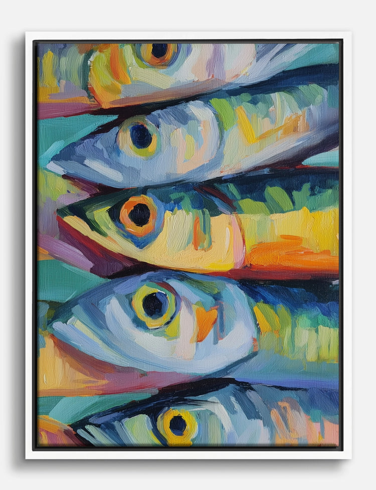 Bold color meets playful energy in this eye-catching sardine arrangement. Each fish pops with lively blues, greens, and sunlit yellows, inviting you to bring a splash of coastal charm to your space.