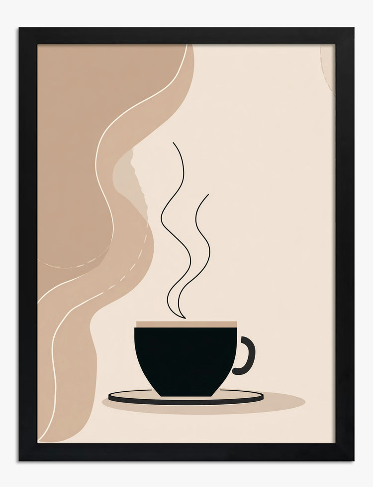 There’s something magical about the first sip—this piece captures that peaceful pause perfectly. The bold, black mug and gentle steam lines create a cozy focal point, inviting you to slow down and savor your space. Soft beige and taupe waves in the background make it a stylish match for modern kitchens, relaxed living rooms, or even your home office. The minimalist vibe pairs effortlessly with both neutral and colorful decor, adding a touch of calm sophistication wherever it hangs. Let this print remind you: great style is simple, welcoming, and always within reach. Every glance is a warm invitation to unwind and feel at home.