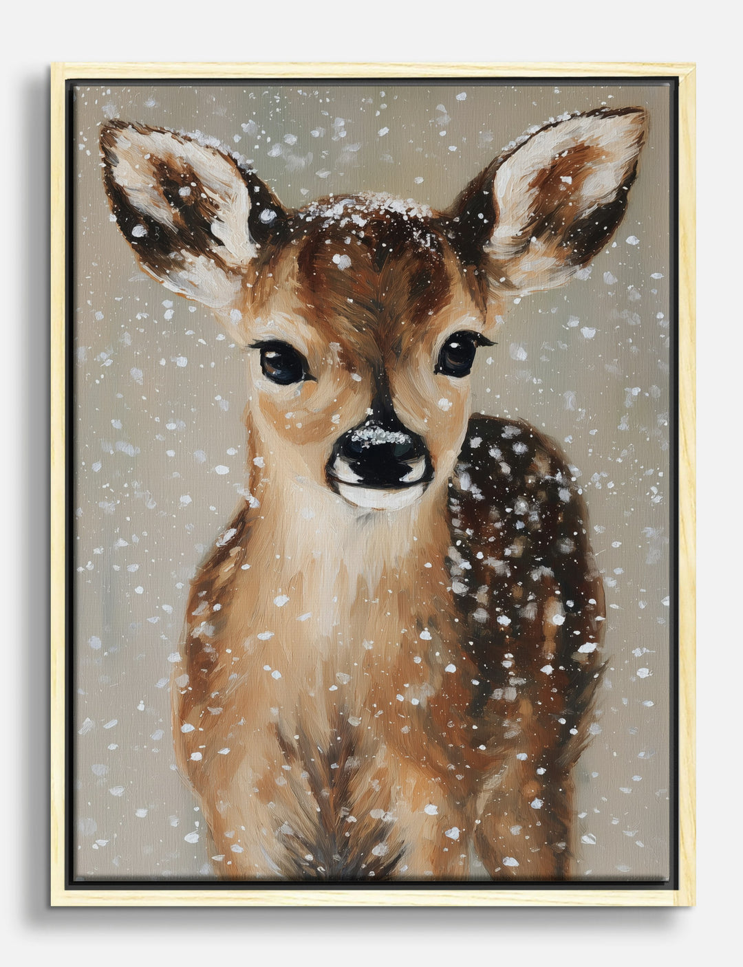 What if calm looked like a pair of curious, velvety eyes? This tender fawn, dusted with softly falling snow, brings a hush of winter magic that never feels cold—just inviting. Warm chestnut browns and creamy taupes meet crisp white snowflakes, creating a palette that plays beautifully with neutrals, Scandi simplicity, rustic textures, or modern farmhouse vibes. It’s the gentle pop your space has been waiting for. Hang it in a nursery for instant coziness, in your bedroom to soften the mood, or near the entryway to welcome everyone with charm. Wherever it lands, you’ll feel that quiet pride of a space that reflects your style—sweet, serene, and confidently you. Affordable, unique, and effortlessly stylish, this piece turns a blank wall into a moment of joy. Pair with an oak frame to echo the fawn’s warmth and make the whole room glow.