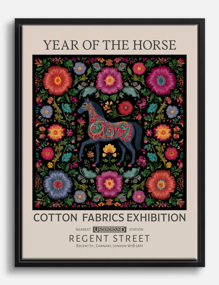 Step into a garden of color and culture with this vibrant Year of the Horse piece. A proud, intricately patterned horse stands at the center, surrounded by a burst of lush, blooming florals—each petal and leaf woven together in a tapestry of energy and artistry. This print instantly enlivens your living room or bedroom, adding a playful yet sophisticated pop to modern and eclectic spaces alike. The bold palette—deep blacks, vivid reds, and rich greens—pairs beautifully with both neutral and colorful decor, making it a versatile accent for any home. Let your walls tell a story of tradition, creativity, and new beginnings. Celebrate your unique style with art that doesn’t just decorate, but transforms your space into a reflection of you.