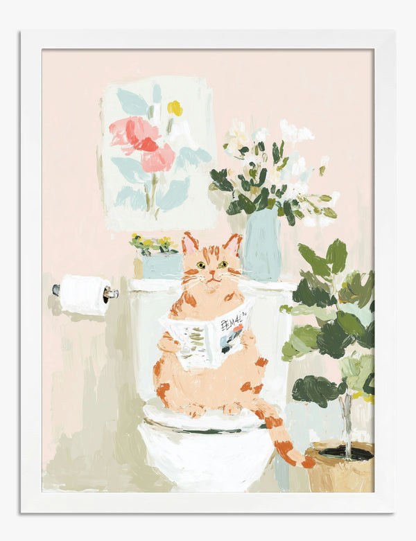 Affiche chat roux aux toilettes avec journal