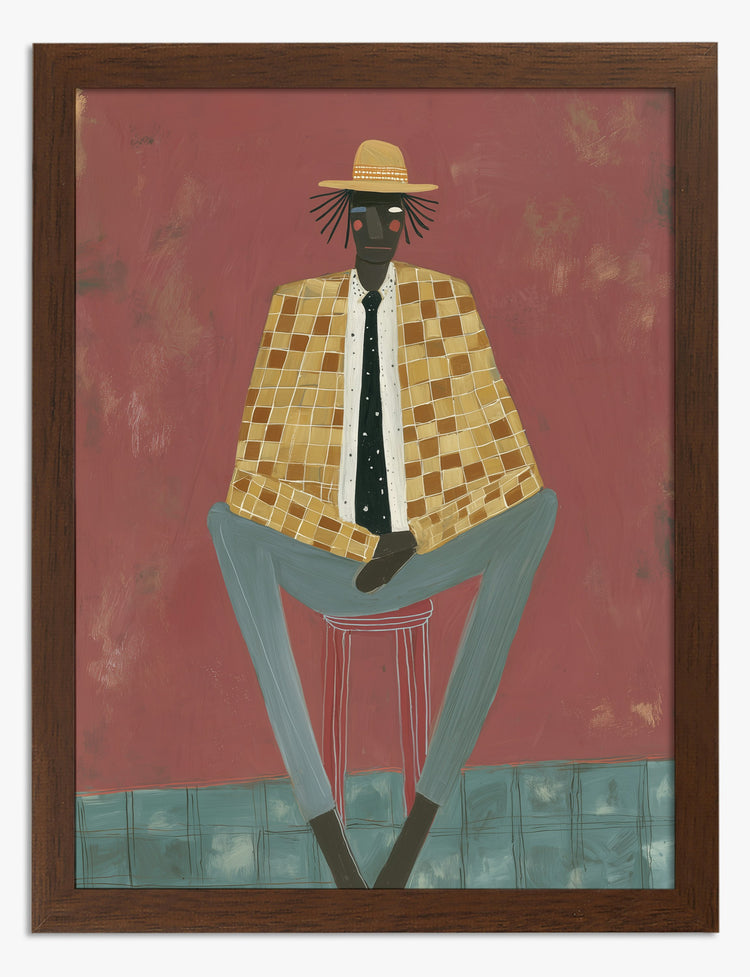 Sharp style meets easygoing charm in this bold portrait. The golden checkered jacket and straw hat set a relaxed, confident tone—like your space just picked up a little swagger. Hang this piece in your living room or office and watch it instantly elevate your vibe. The warm earth tones and subtle reds work with everything from modern neutrals to eclectic, colorful spaces. It’s more than just a statement—it’s a reminder that your home should reflect your unique personality. With this artwork, you’ll feel a renewed sense of pride every time you walk in the door. Go ahead—let your walls show off a little.