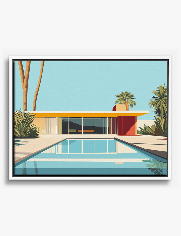 Bold lines, sun-drenched color, and a splash of poolside cool—this piece instantly transforms your space into a mid-century oasis. Think breezy mornings, endless blue skies, and the effortless elegance of retro California living. Let your living room or office pop with style and confidence. This artwork’s crisp palette of sky blue, warm yellow, and striking red plays beautifully with neutral furnishings, while the scene’s laid-back vibe brings a sense of pride and escape to your everyday. You don’t need a plane ticket to feel like you’re on vacation—just hang this on your wall and watch your space come alive.