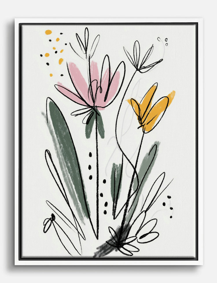 Soft, sketchy blooms bring a breath of fresh air right into your home. This playful floral piece feels like a spontaneous bouquet—effortlessly brightening any wall with hand-drawn charm and a pop of pink and golden yellow.