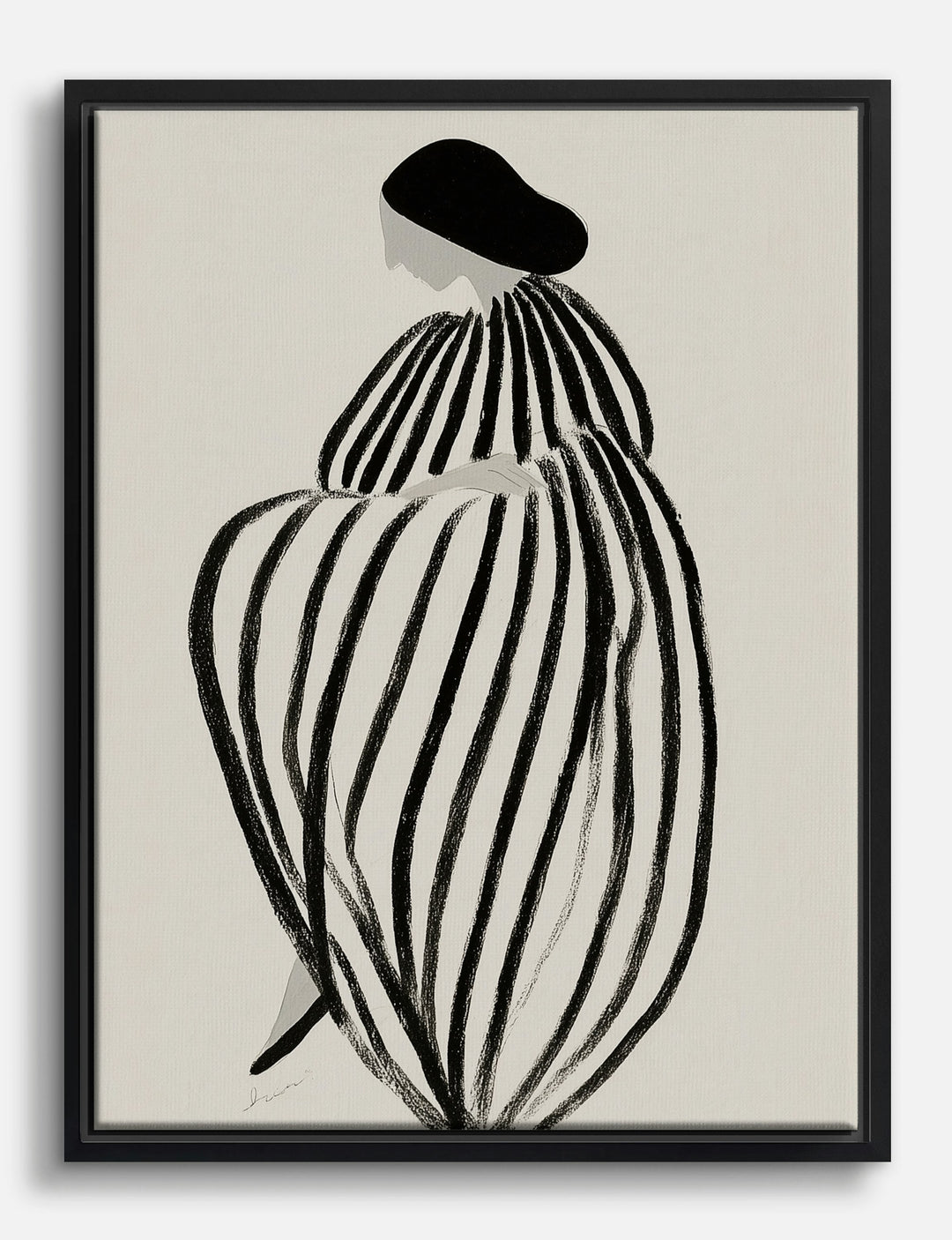 Bold lines and soft curves come together to create a striking visual moment in this piece. The flowing stripes and gentle posture capture a sense of quiet confidence — a reminder that style is as much about presence as it is about detail.