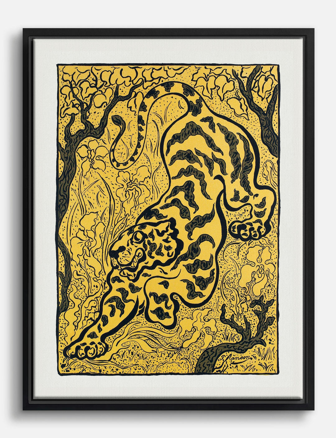 A bold leap of energy for your walls—this striking tiger, rendered in inky lines and glowing gold, brings instant drama to any space. The wild movement and lush, swirling foliage turn your home into a storybook jungle, full of curiosity and confidence.