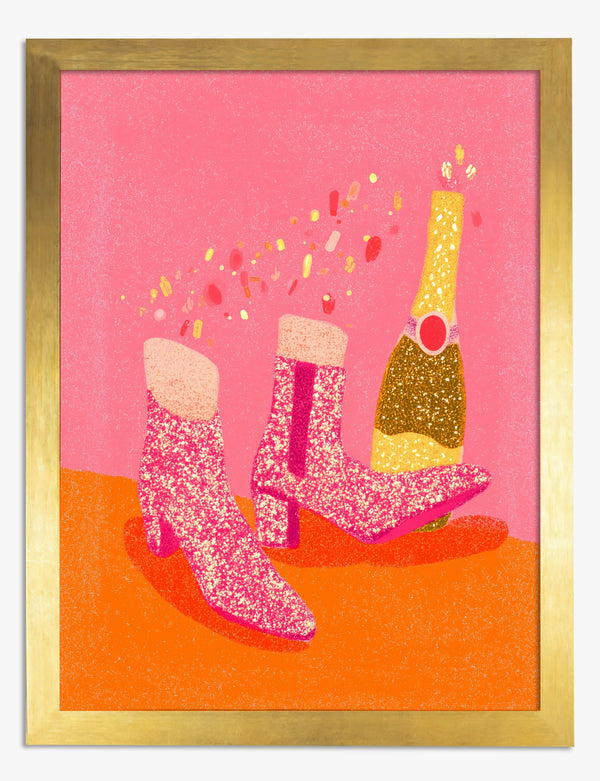 Affiche bottes pailletées roses et vin pétillant