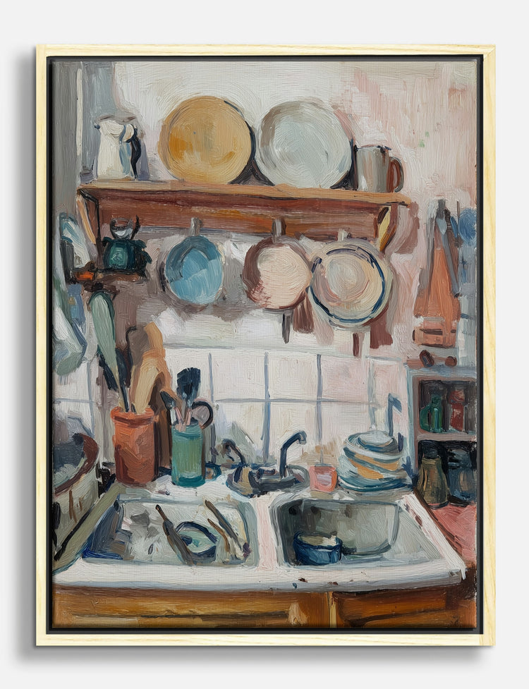 There’s something beautifully honest about a kitchen sink full of dishes—proof of shared meals, laughter, and everyday magic. This cozy still life captures the heart of home: the gentle chaos, the warmth of well-loved pots, and the stories written in every cup and plate.
