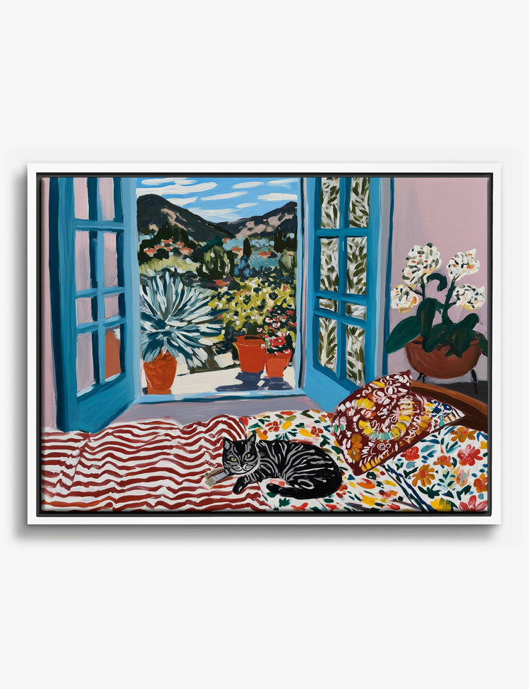 Wake up to a day that feels like a getaway. Bold blue windows swing open to a sun-soaked garden, where lush plants and distant mountains invite a sense of endless summer. A striped cat naps peacefully on a riot of patterned linens—proof that comfort and color can live side by side. This piece brings a playful, uplifting vibe to your bedroom or living room, instantly making your space feel curated and full of personality. The vibrant palette—think cerulean blues, lush greens, and vivid reds—pops against both neutral and colorful decor, so you can mix, match, and truly make it yours. Let your home reflect your unique story. With this print, you’ll turn everyday moments into something extraordinary—no renovation required.