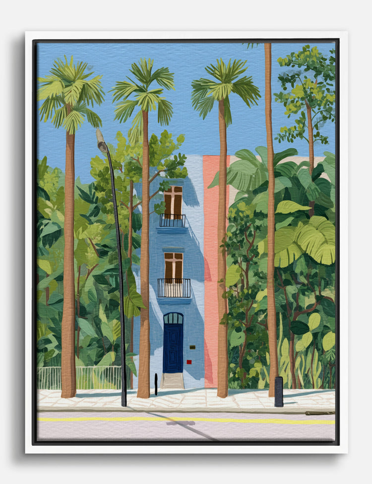 Sun-drenched palms frame a charming pastel hideaway, inviting you to bring vacation vibes right into your home. The playful blend of soft blue and blush pink pops against lush greenery, instantly brightening your favorite spot.