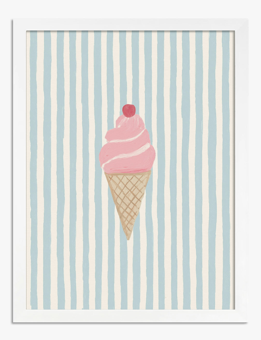 A single swirl of strawberry-pink joy, topped with a cherry, brings instant cheer to your walls. This piece is pure nostalgia, blending playful sweetness with a touch of retro charm. Why settle for bland when you can add a pop of personality to your kitchen or breakfast nook? The soft blue and cream stripes pair effortlessly with modern, vintage, or minimalist decor, making it easy to refresh your space with just one stylish move. It’s more than just a treat for the eyes—it’s a daily reminder that home should make you smile. Hang this up and watch your space become the happiest spot in the house.
