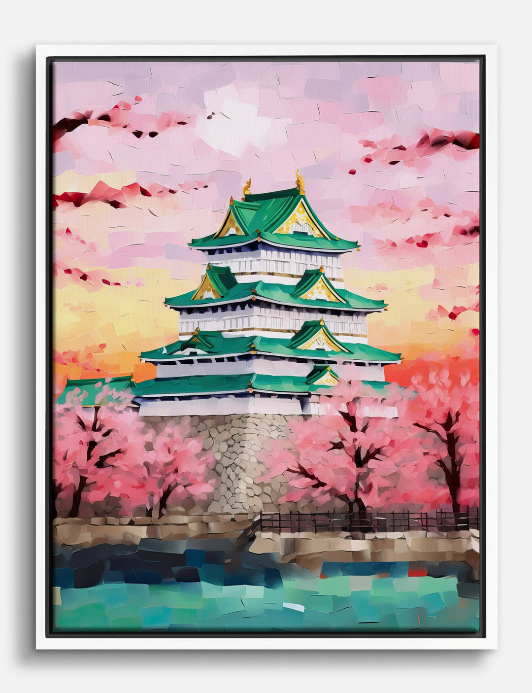 A bold blend of tradition and beauty, this piece instantly whisks you away to a dreamy spring evening in Japan. Vibrant pink cherry blossoms and the iconic green-roofed Osaka Castle pop against a glowing sunset sky, bringing both color and calm to your space. It’s perfect for your living room or bedroom—anywhere you want to spark joy, wanderlust, or a sense of serene pride. Let your home reflect your adventurous spirit, all without booking a plane ticket.